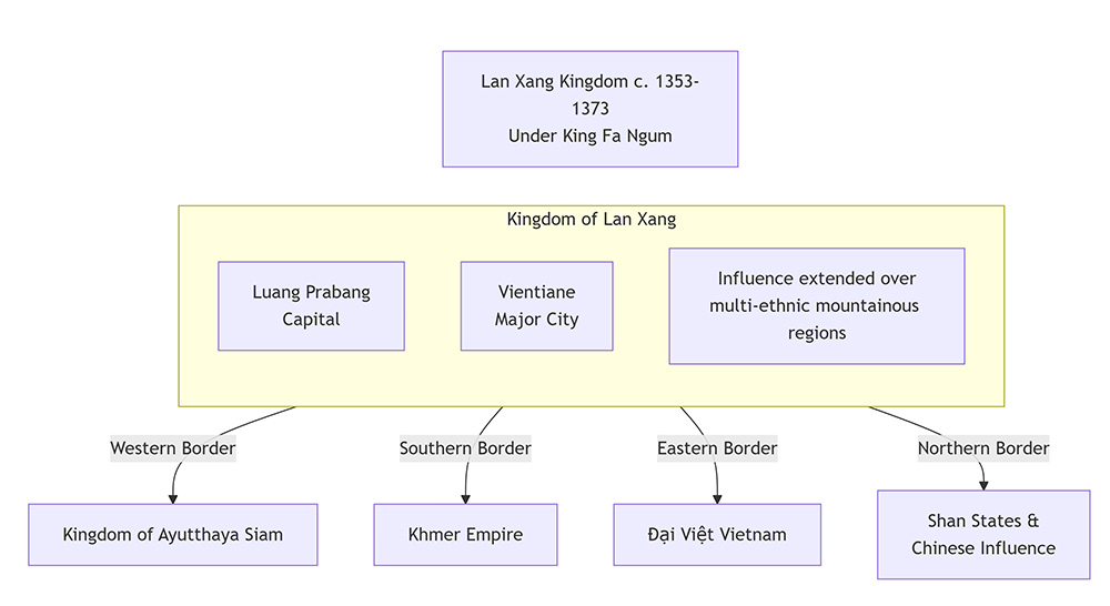 Lan Xang’s Buddhist identity was shaped in constant dialogue with its powerful neighbors (see diagram 1a). Its relations with the Lanna kingdom (centered in Chiang Mai), Ayutthaya (Siam), and the Khmer regimes were a complex blend of religious kinship and political rivalry (see diagram 1b).