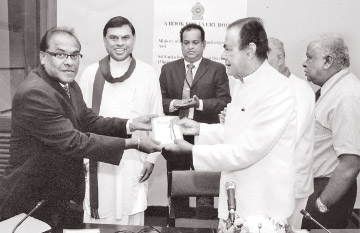 << Prime Miniser D M Jayaratne handing over a copy of “Why Worry” written by late Dr.Kirille Sri Dhammananda Thera to Lanka Hotel Association Chairman M Shanthkumar. Economic Development Minister Basil Rajapaksa is also in the picture.