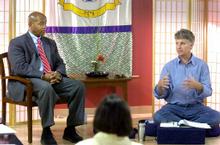 Naropa University’s new president, Stuart Lord, left, sits in on a contemplative education class held by Michael Girodo. Lord, an ordained Christian minister, finished his first week as president of the Buddhist-inspired school.