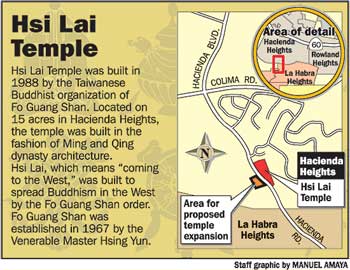 Ten years ago the temple bought 26 acres near the Puente-Chino Hills Wildlife Corridor just off Hacienda Boulevard. Of that, 5 acres would be used for the expansion, Kuo said. The other 19 acres would remain open space.