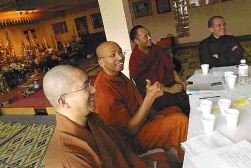 << Organizers from local Buddhist temples and meditation centres meet at the Phommaviharam Buddhist Temple in Kitchener to plan an upcoming Buddha Day, the first event they are presenting as a group. From the left are: Ven. Xu Zhao of the Buddhist Prajna Temple, Ven. Deba Mitra Bhikkhu of the Phommaviharam Buddhist Temple, Lama Karma Phuntsok of the Palpung Yeshe Chokhor Meditation Centre and Thich Dao Hanh of the Vien Quang Vietnamese Buddhist Association.